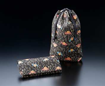 更紗は古くから印傳屋に伝わる技法のひとつ。一色ごとに型紙を替えて色を重ね、目にも鮮やかな模様に仕上げています。