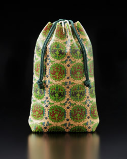 いにしえより吉祥のシンボルとして尊ばれる鳳凰と龍。丸文の中に「向い鳳凰」外に「向い龍」の連続模様を、一色ごとに型紙を替えて色を重ねる「印傳の更紗技法」で表現しています。印傳屋は、印傳の歴史を永く伝承していくために伝統的な模様の再現を行っています。ふたたび色鮮やかに甦る「五色丸」の伝統美を青山店でご覧ください。