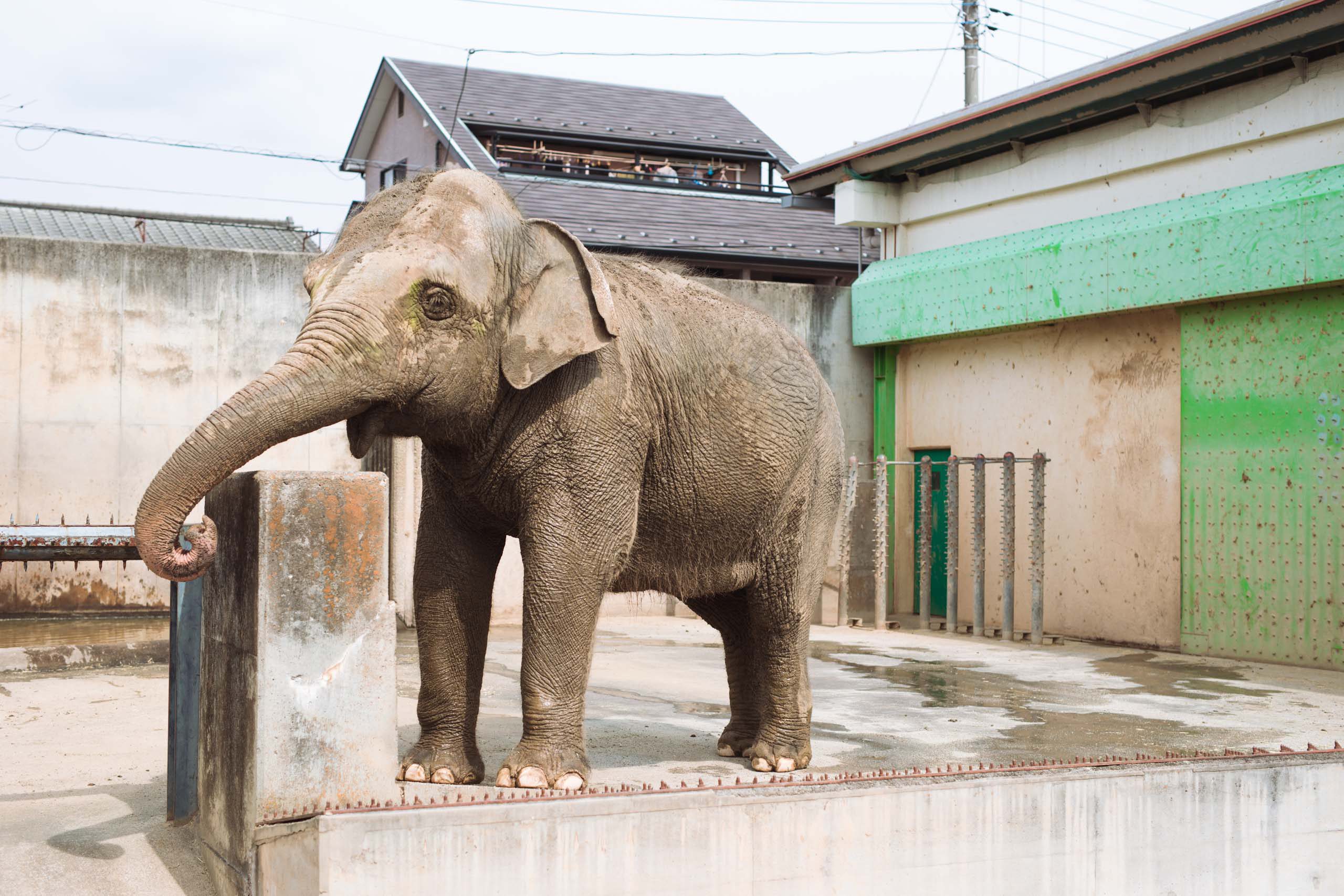 1978年生まれ、41歳のテルは男の子のような名前ですが、実は女の子。テルが過ごしている飼育エリアは入口から近く、こんなにも早く対面できるのかという驚きとともに、檻のすぐ後ろに2階建ての民家が見えるという立地に思わず笑みがこぼれます。