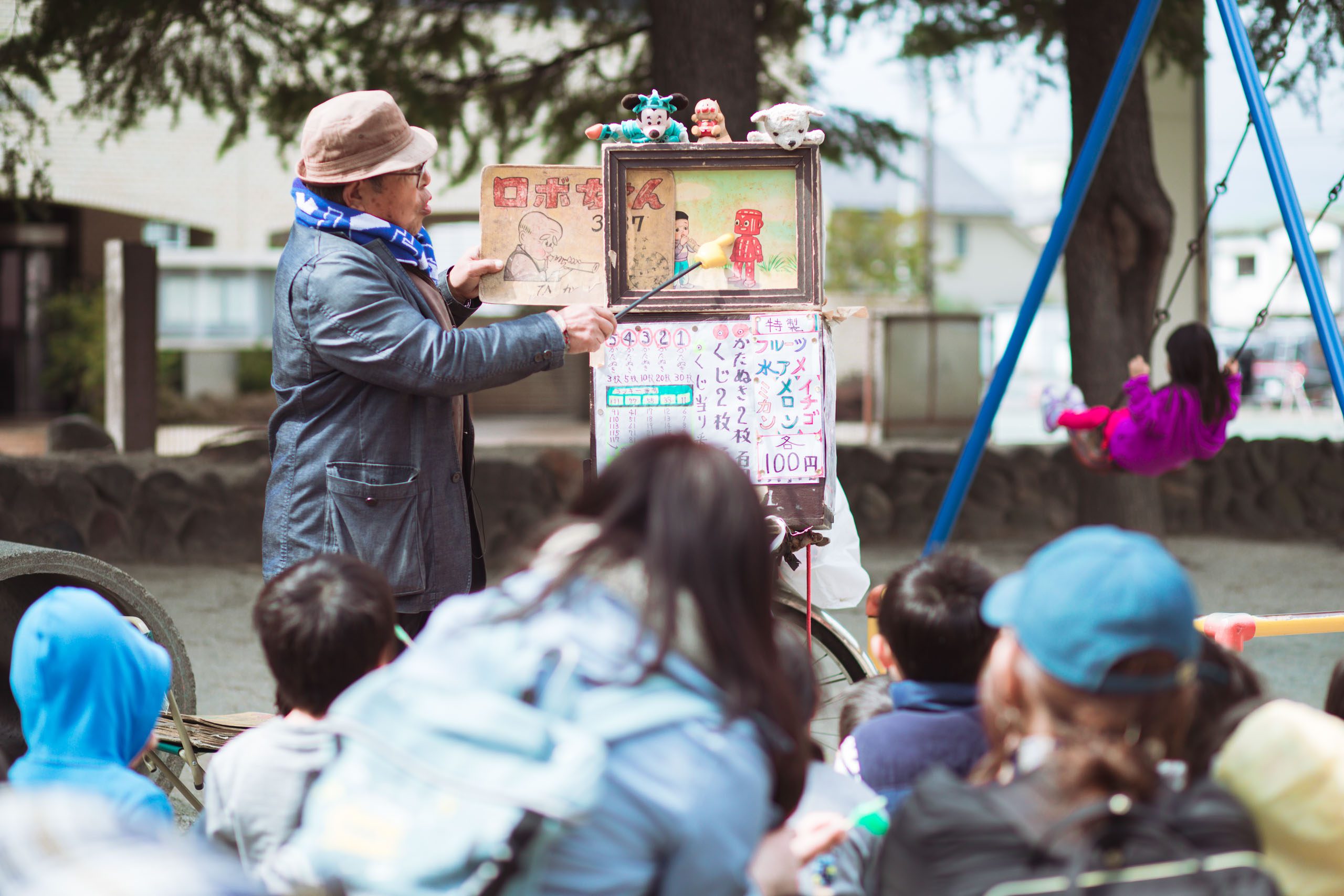 どこからか「カチカチ」と拍子木の音が聴こえてきたら、それは紙芝居の時間の合図です。自転車の荷台に紙芝居を乗せたおじさんが現れると、ぞろぞろと子どもたちが集まってきます。独特の語り口調は子どもたちにとっては新鮮。大人たちは懐かしさがこみ上げてタイムスリップしたような感覚に。水飴片手に紙芝居を楽しむという昭和の風景は、平成の終わりにも受け継がれています。