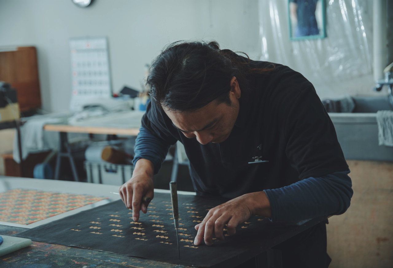 一枚一枚の性質が異なる革の特徴を確かめながら、型紙のずれを防ぎ色を重ねていきます。均等に色をのせるには、高度な技術と時間を要します。
