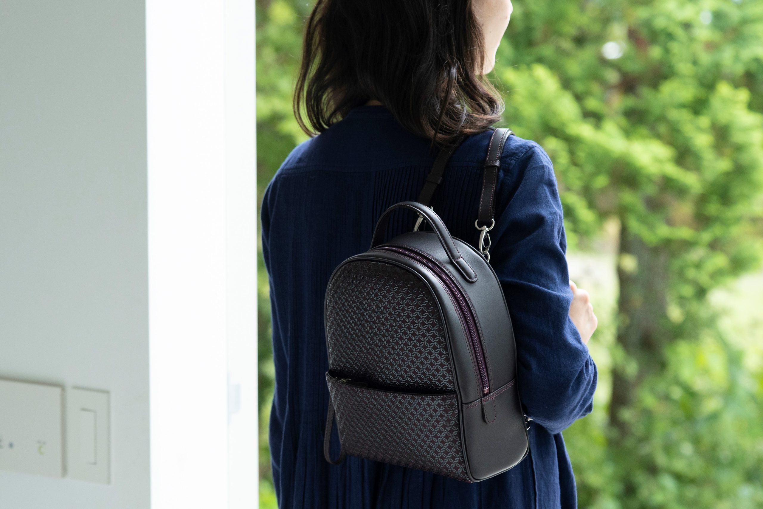 小ぶりなリュックタイプのバッグは今年の新作です。肩紐が取り外しでき、手提げとしてもお使いいただけます。
