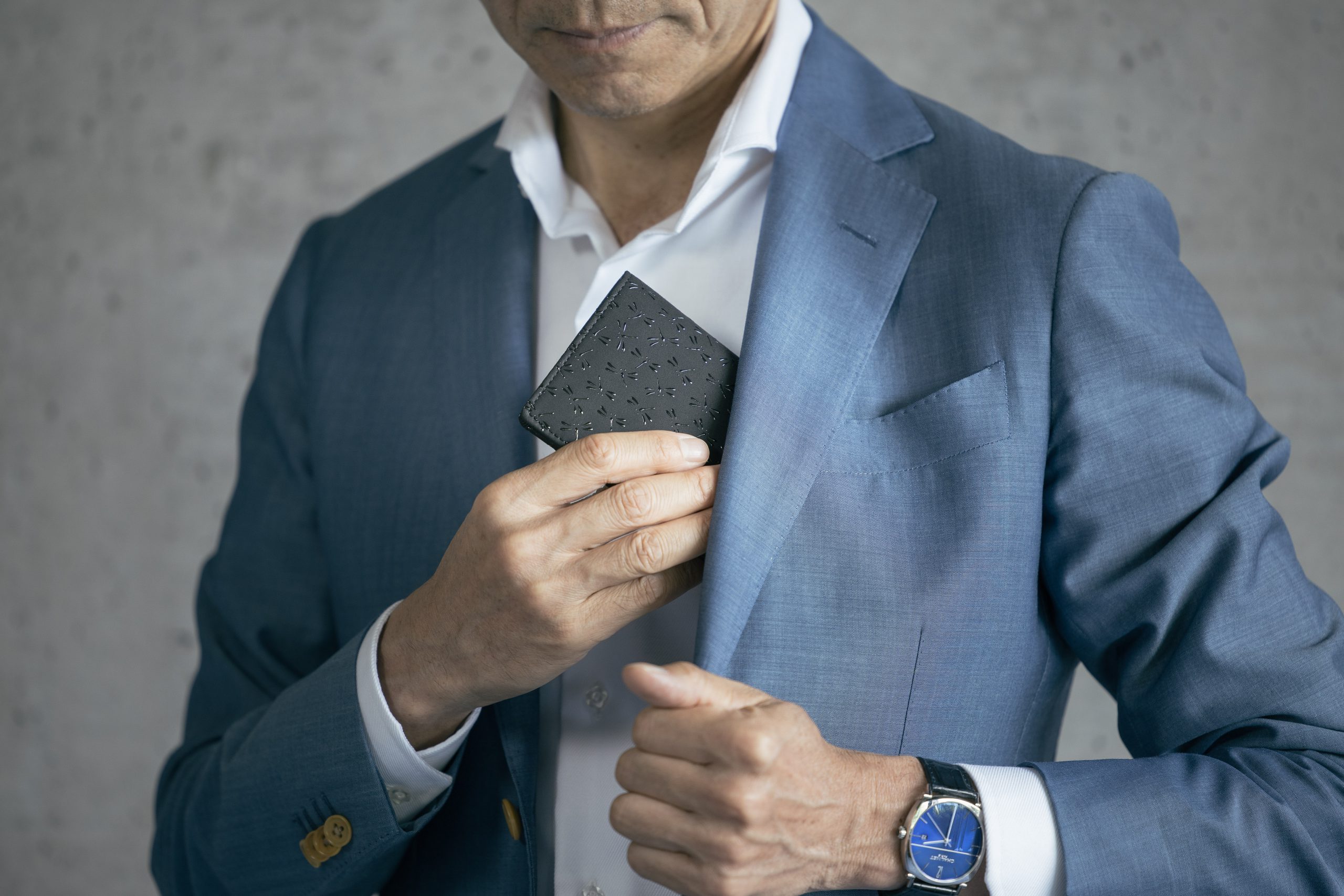 お札やカードのみを収めるタイプのお財布で、ジャケットの胸のポケットに入れる事ができます。スタイリッシュな装いに粋を添えるアイテムとしてご支持をいただいておりました。このたび10周年を記念して「とんぼ」模様を数量限定で復刻いたします。