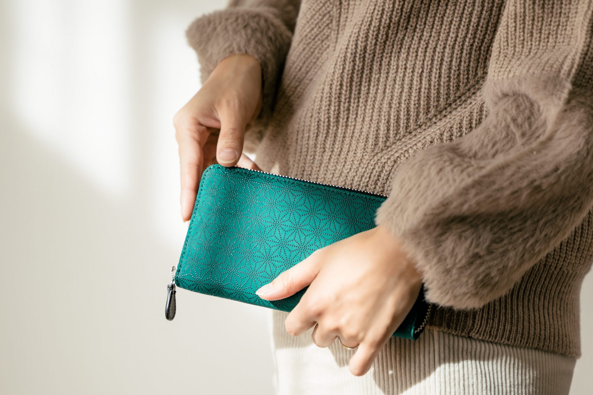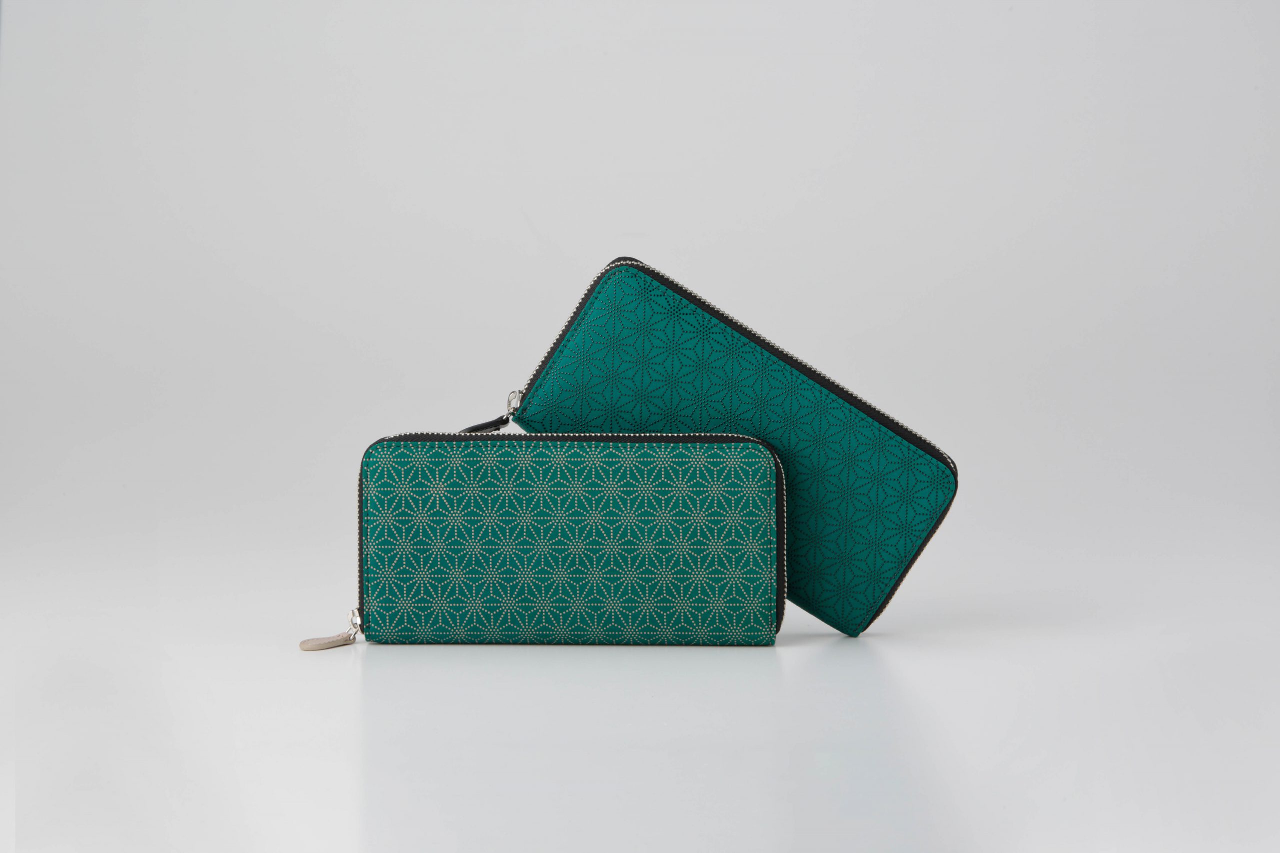 印傳屋名古屋御園店では、早春をイメージし染め上げた新緑色の革に「麻の葉」模様をあしらった束入れを、特別にご用意しました。