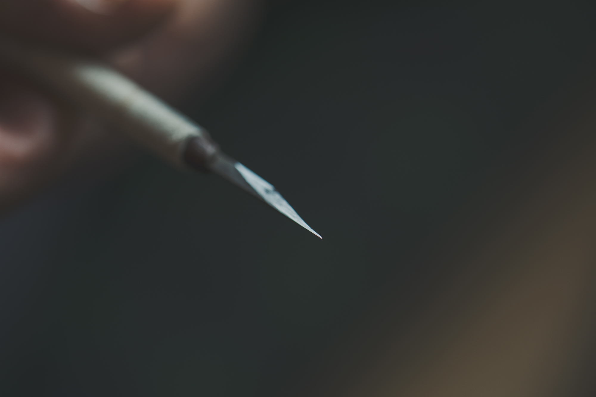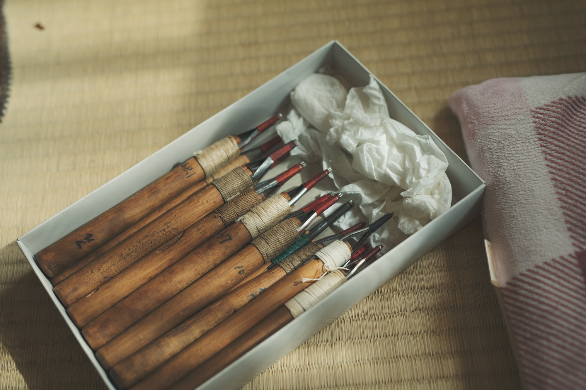 繊細な模様を彫る突彫の小刀を見せていただきました。持つと鉛筆のように軽く、先端に鋼の刃が付いているのを感じさせない軽やかな感覚でした。刃先の幅はわずか1~2mm。細密な模様はその鋭利な切っ先をこまめに動かして彫られていくのです。