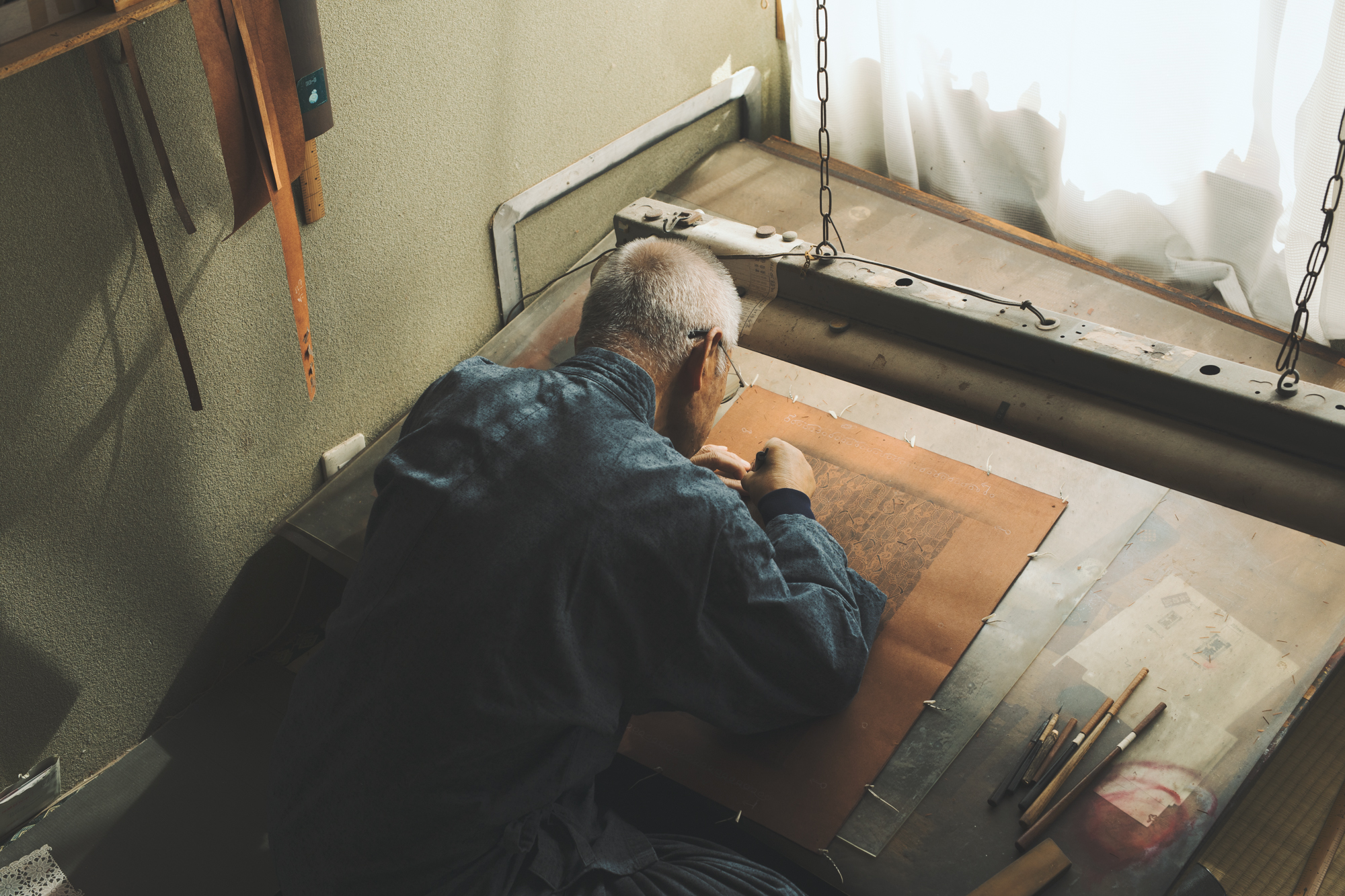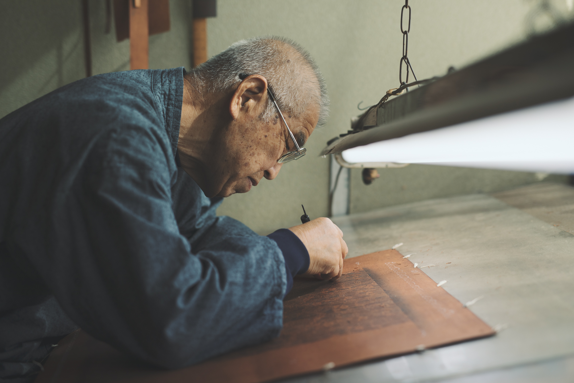 木村さんは15 歳のときにこの道を志し、中学卒業後、叔父の彫り職人のもとに弟子入り。3年の修行の後にひとり立ちして、64 年間も彫りの腕を磨き続けています。現在、80 歳の現役です。2009 年には伝統工芸の発展に貢献してきた長年の功績を称えられ瑞宝単光章を受章されました。
