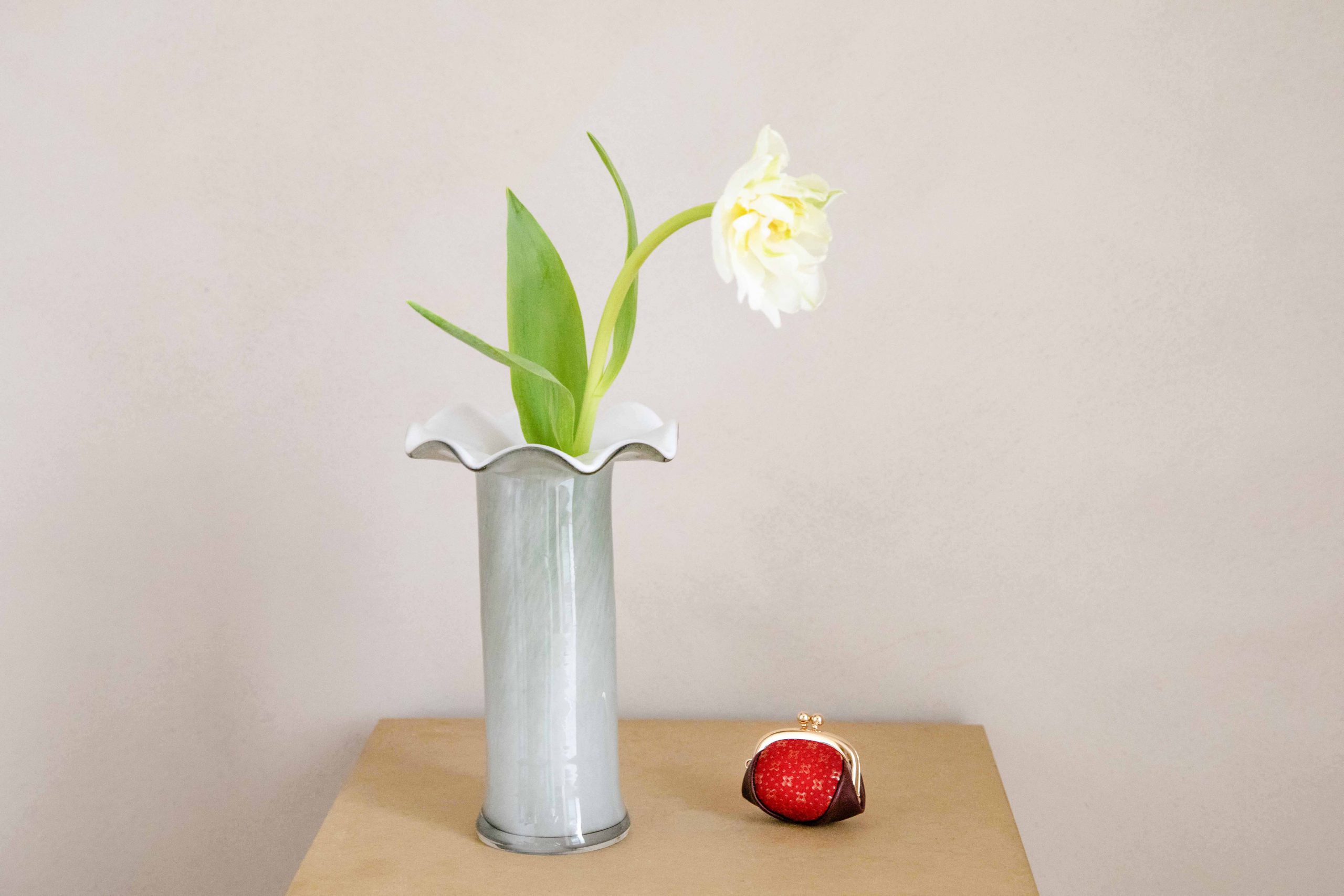 みずみずしく透け感のある花びらにまっすぐ伸びる若草色の茎。春を連想させる花として誰もが思い浮かべるのがチューリップではないでしょうか。「無垢な白はどんな色にも合うので、その時々の気分によって花瓶を選んでほしいです」と香内さん。今日のように落ち着いたグレーを選ぶと空間がすっとした印象になります。