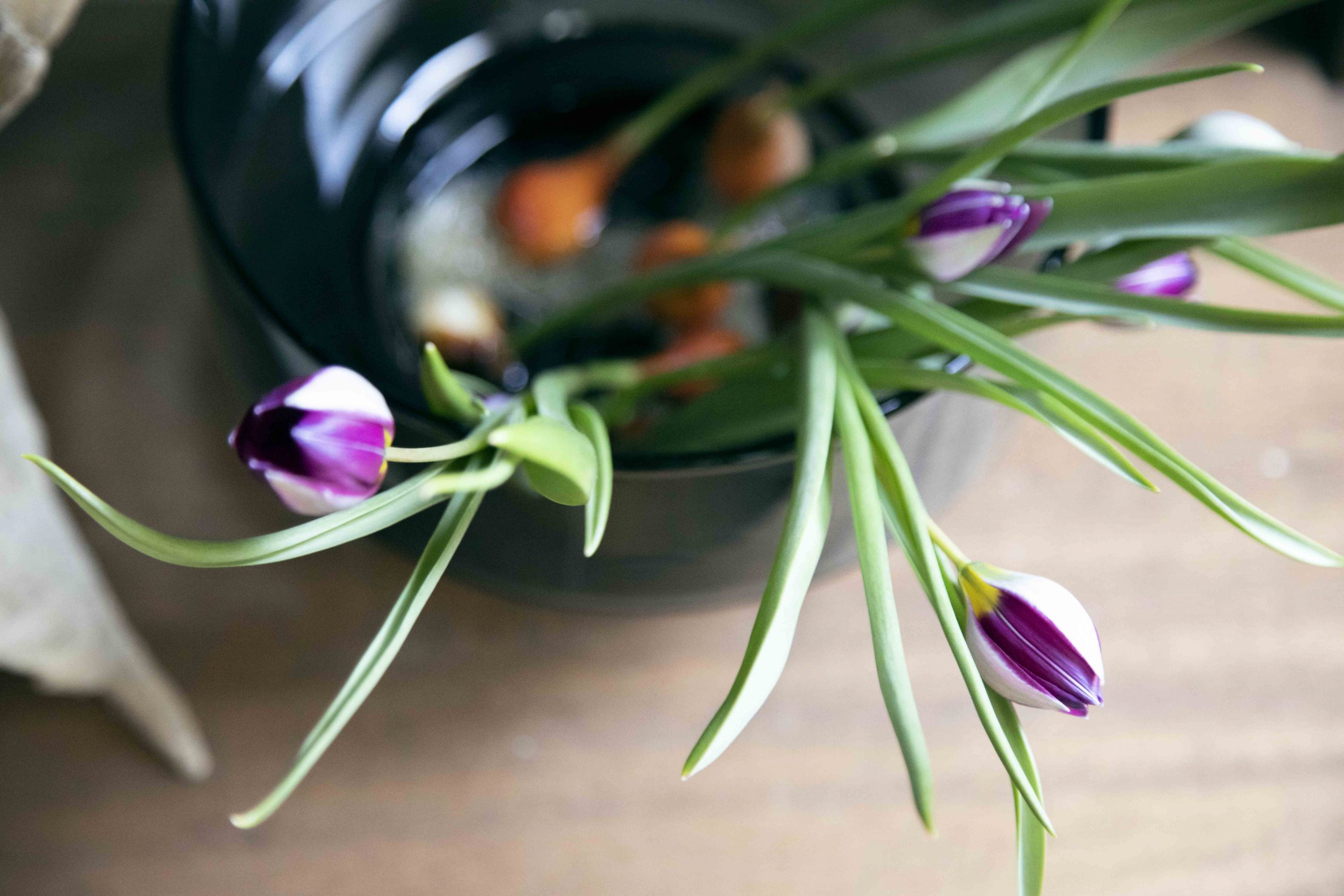 球根付きの小さなチューリップは、全体が見えるガラス製で浅めのものがおすすめ。「お皿に水を張り、料理を盛り付けるように生けてみるのもステキです」と教えてくださいました。