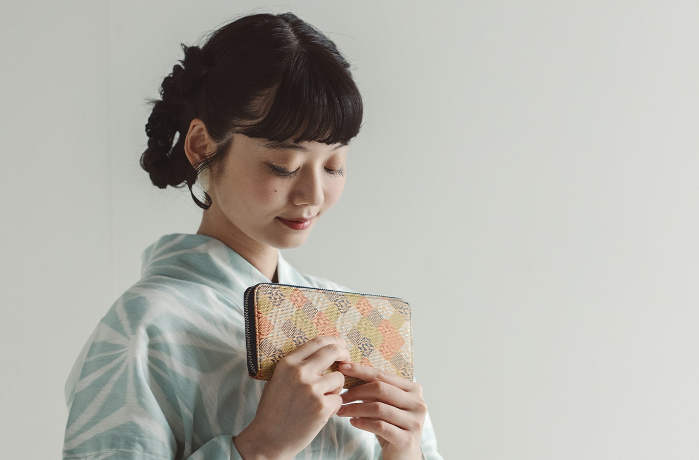 このたび「印伝の更紗フェア」の限定商品として、印傳屋に伝わる「向鶴」を復刻。多色のうち、パールの煌めきを放つ水色を用いて、これまでにない「向鶴」を作り上げました。数量限定の特別な印伝、この機会にぜひご覧ください。