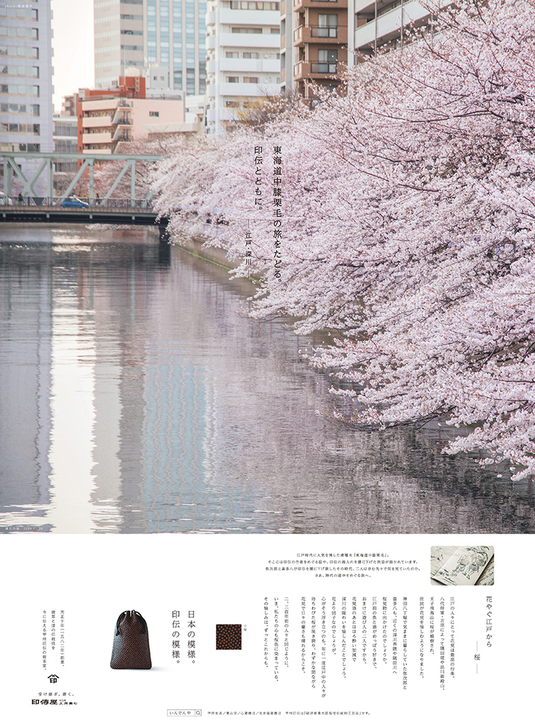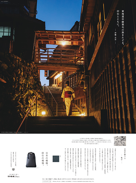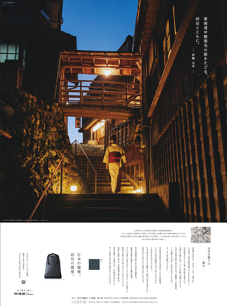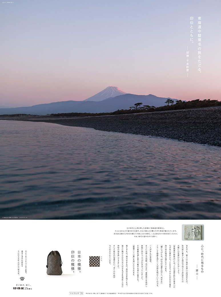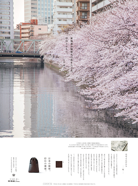 江戸時代に人気を博した滑稽本 『東海道中膝栗毛』。 弥次郎と喜多八が印伝を腰に提げ旅したその道中には、 現代にまで受け継がれる日本の模様にちなんだ場面がありました。 さあ、時代の道中をめぐる旅へ。