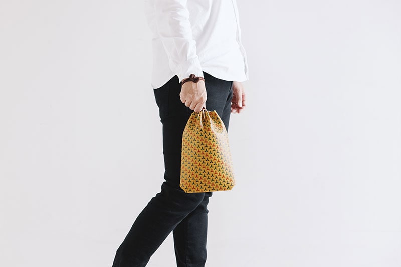 やわらかな山吹色に染めた鹿革に、更紗で多彩な色を重ね、さらに艶やかな漆模様で覆う、