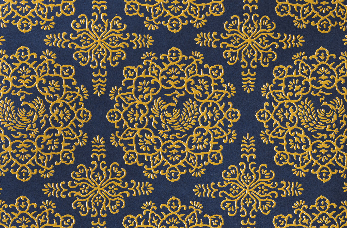 深みのある紺色に染め上げた鹿革に、孔雀を崇めるように繁栄を表す唐草を放射状に広げ、艶やかな黄漆で表現しました。